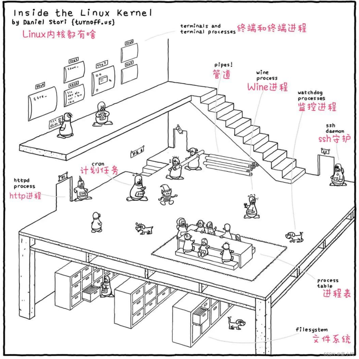今天为大家解读一副来自极客漫画网站作者Daniel Stori关于Linux 有趣的作品。