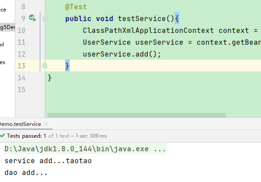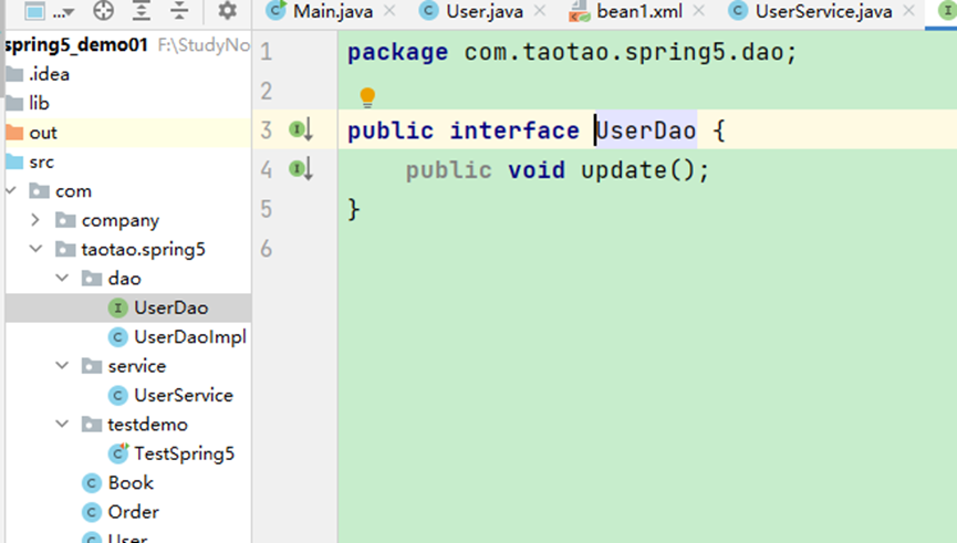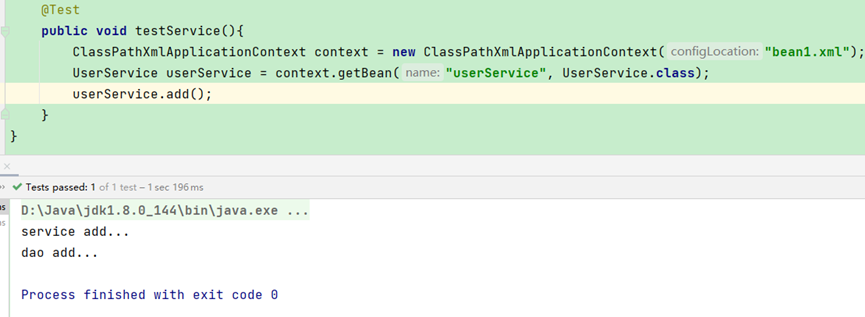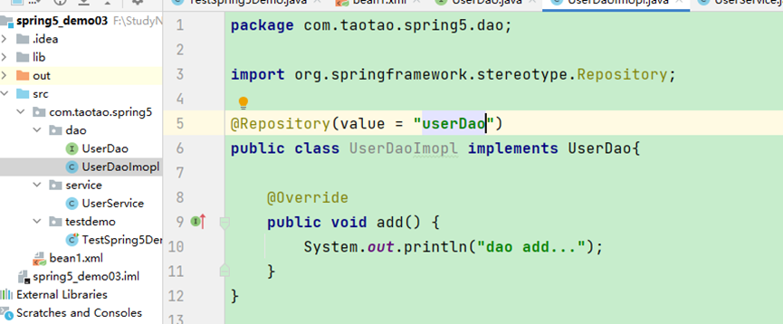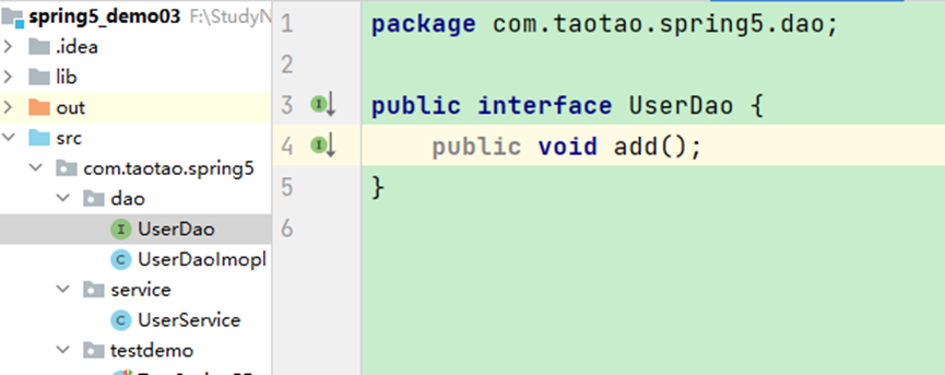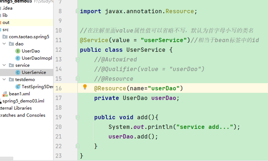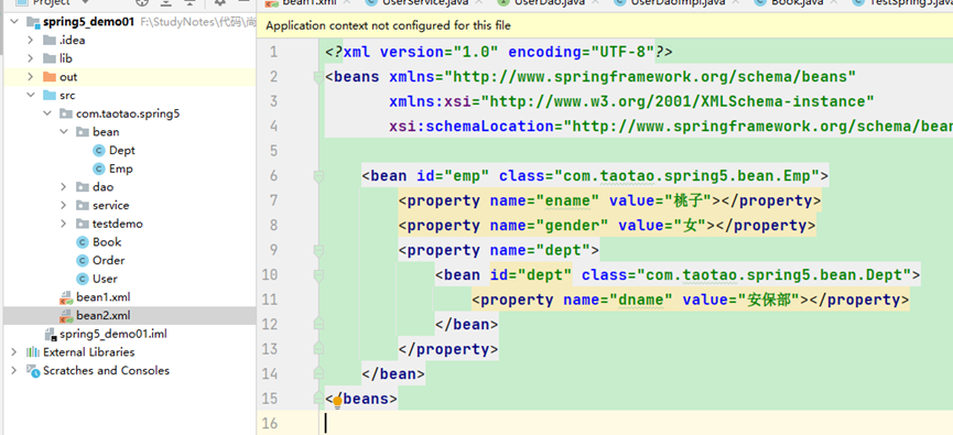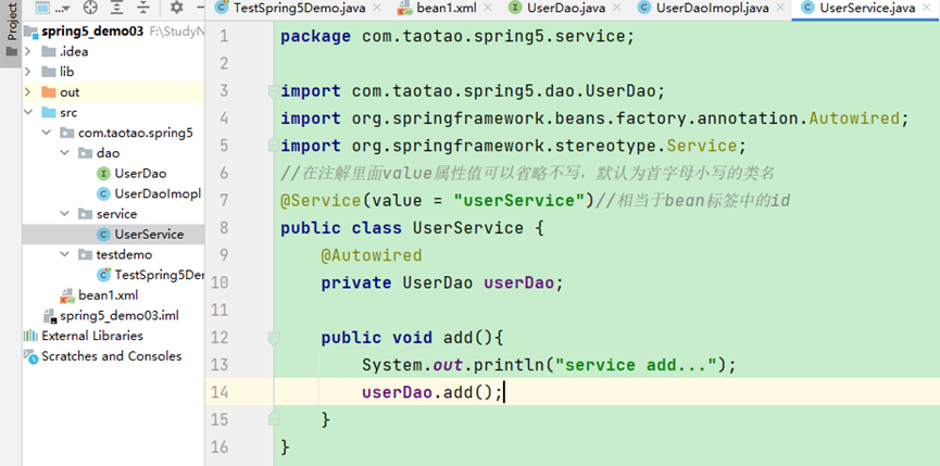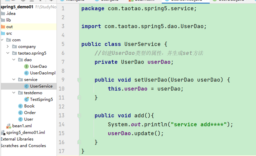 创建两个类service和dao,在service中调用dao,在spring配置文件中进行配置