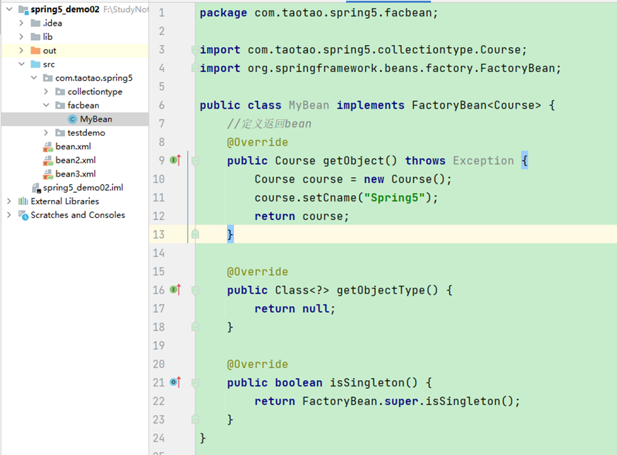 第一步创建类,让这个类作为工厂bean,实现接口FactoryBean;第二步实现接口里面的方法,在实现的方法中定义返回的bean类型
