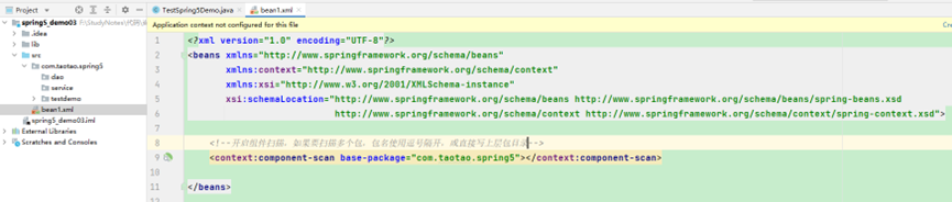 第二步:开启组件扫描,在配置文件中引入context名称空间