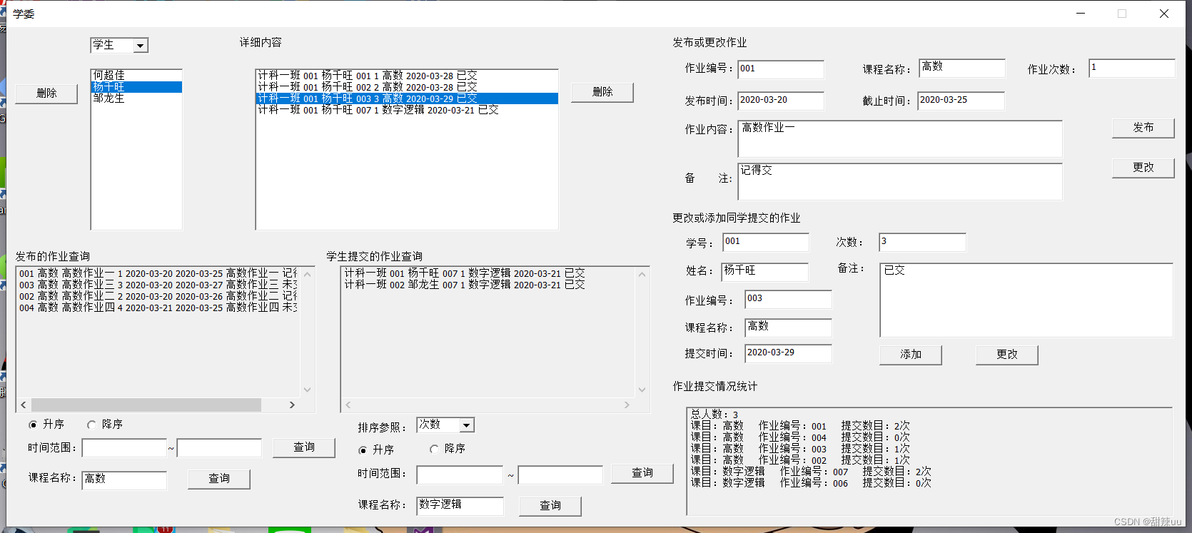 学委界面使用情况,该界面可分为浏览区、查找区、发布或更改作业区、更改或添加同学提交的作业区、作业提交情况统计区。在浏览区用户可以查看同学提交的作业和每个课程发布的作业,当点击详细内容 listBox 时,里面的内容会出现在相应的编辑框中;查找区可以分为学委发布的作业查找和学生提交的作业查找。