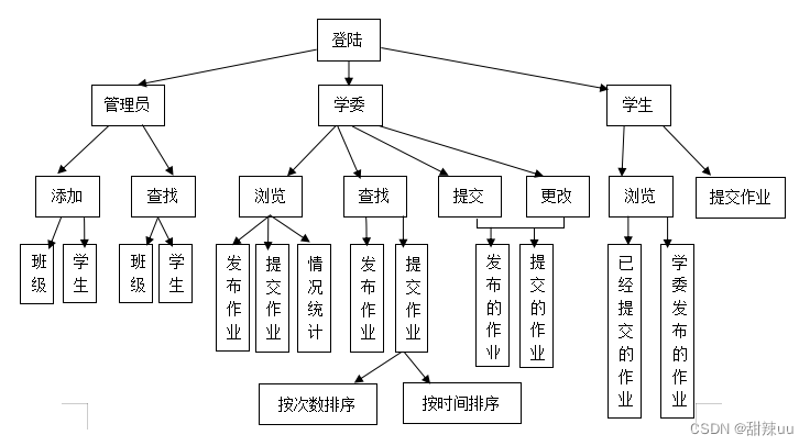 学委作业管理系统要求实现五大功能部分,分别是身份登录部分、管理员部分、学委部分、学生部分、文件储存部分。