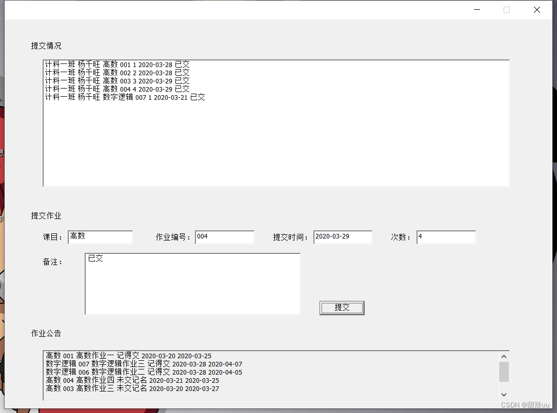 学生对话窗口,实现学生查看和提交作业的功能,提交情况 listBox 显示该学生已经提交了的作业数据;提交作业,学生在提交作业部分填写相应的内容点击提交即可保存到数据文件中;作业公告,显示学委发布的作业,提醒学生做作业。