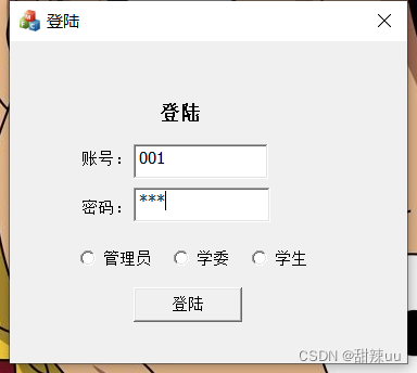 登陆使用情况,如右图所示。账号为可显示的输入框,密码为隐秘数字后的输入框。管理员、学委、学生为单选框,点击登陆,账号、密码和身份正确后即可顺利进入相应的应用界面
