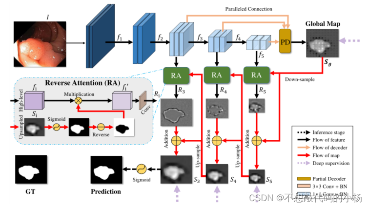 为了解决这一问题本文通过消除前景对象的方式逐步挖掘息肉区域的详细结构信息。本文的网络结构没有像以往的U型编解码网络那样从所有层次聚合特征,而是自适应的学习三个并行高级特征的反向注意。换句话说,网络的体系结构可以通过从高级侧输出特征中删除现有估计的息肉区域,从而依次挖掘互补区域和细节,其中现有的估计是从较深层次的上采样。