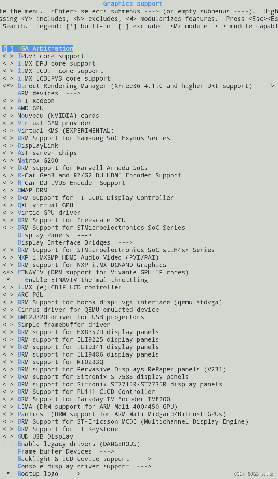 我们在 linux-menuconfig 里面如下设置:进入 Device Drivers ---> Graphics support
