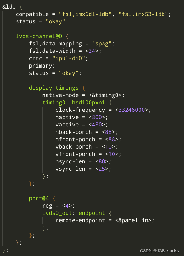 display-timings {native-mode = <&timing0>;timing0: hsd100pxn1 {clock-frequency = <33246000>;hactive = <800>;vactive = <480>;hback-porch = <88>;hfront-porch = <88>;hsync-len = <80>;vback-porch = <10>;vfront-porch = <10>;vsync-len = <25>; };};