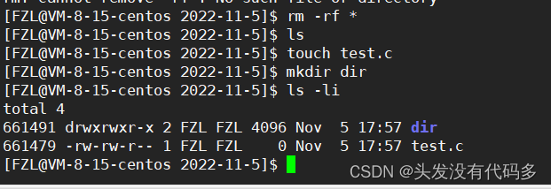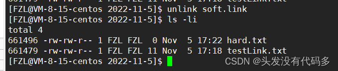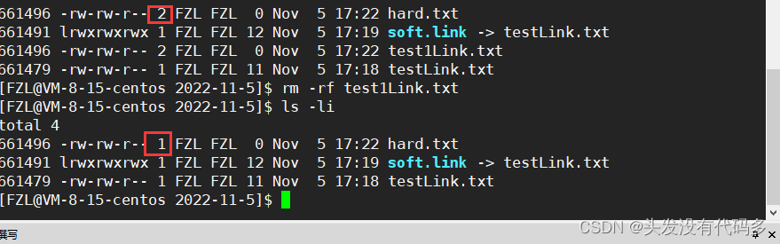 这是因为刚才在删的时候,把test1Link.txt的Inode和文件名的映射关系在目录里去掉了,但Inode还在,而这里由2变1的数字被称作硬链接数