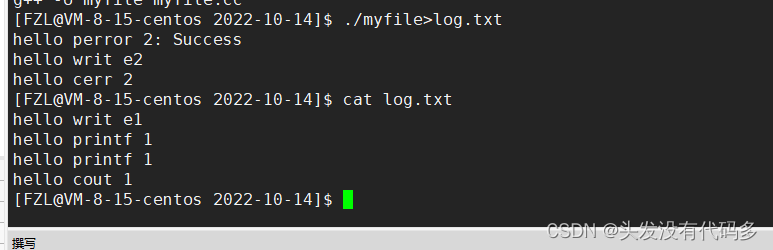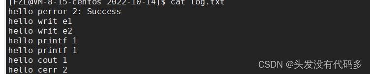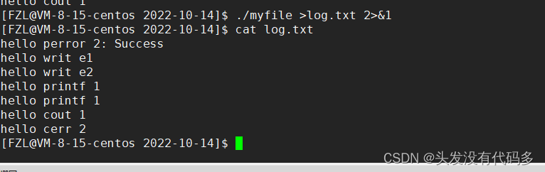 含义:1重定向到log.txt,把1号文件描述符里的内容拷给2,也就是说1和2里面是同一个文件