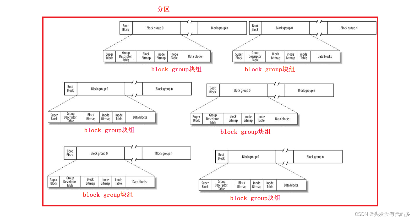 我们将块组分割称为上面的内容。并且写入相关的数据,每一个块组都这么干,整个分区就被写入了文件系统信息。这个过程就叫格式化