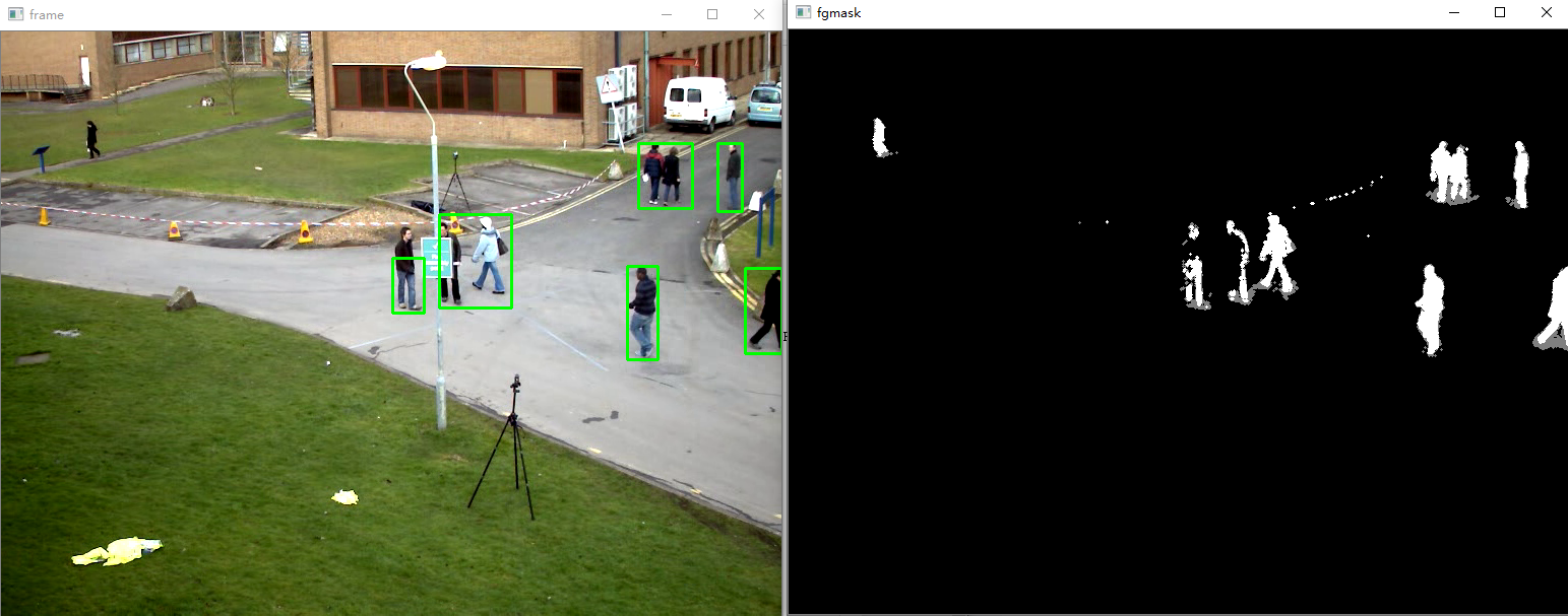 fgbg = cv2.createBackgroundSubtractorMOG2()while(True):ret, frame = cap.read()fgmask = fgbg.apply(frame)#形态学开运算去噪点fgmask = cv2.morphologyEx(fgmask, cv2.MORPH_OPEN, kernel)#寻找视频中的轮廓 im, contours, hierarchycontours, hierarchy = cv2.findContours(fgmask, cv2.RETR_EXTERNAL, cv2.CHAIN_APPROX_SIMPLE)for c in contours:#计算各轮廓的周长perimeter = cv2.arcLength(c,True)if perimeter > 188:#找到一个直矩形(不会旋转)x,y,w,h = cv2.boundingRect(c)#画出这个矩形cv2.rectangle(frame,(x,y),(x+w,y+h),(0,255,0),2) cv2.imshow('frame',frame)cv2.imshow('fgmask', fgmask)k = cv2.waitKey(150) & 0xffif k == 27:breakcap.release()