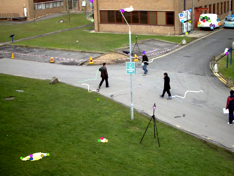 在进行前景检测前,先对背景进行训练,对图像中每个背景采用一个混合高斯模型进行模拟,每个背景的混合高斯的个数可以自适应。然后在测试阶段,对新来的像素进行GMM匹配,如果该像素值能够匹配其中一个高斯,则认为是背景,否则认为是前景。由于整个过程GMM模型在不断更新学习中,所以对动态背景有一定的鲁棒性。最后通过对一个有树枝摇摆的动态背景进行前景检测,取得了较好的效果。(简单来说就是背景中道路、树木、房子等都有自己的高斯分布,后面新来的比如“人、车”等即新的像素高斯分布看它与之前的背景的是否匹配,不匹配就是新的。)