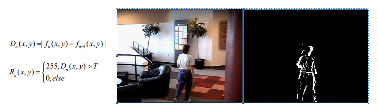由于场景中的目标在运动,目标的影像在不同图像帧中的位置不同。该类算法对时间上连续的两帧图像进行差分运算,不同帧对应的像素点相减,判断灰度差的绝对值,当绝对值超过一定阈值时,即可判断为运动目标,从而实现目标的检测功能。