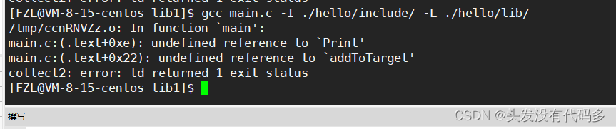 我们已经声明去哪里找头文件和库了,但此时还会报错,这是因为我们无法保证lib路径下只有一个库,我们没有告诉编译器是lib路劲下得哪一个库,用-l(小写L)
