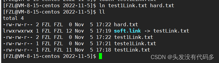 删除test1Link.txt之后并不影响hard.txt的存在,这里由2变为1,而且我们发现Inode此时还在。