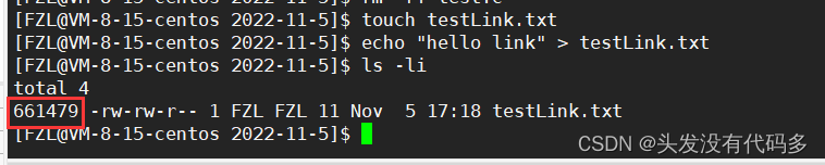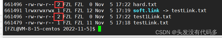 这是因为刚才在删的时候,把test1Link.txt的Inode和文件名的映射关系在目录里去掉了,但Inode还在,而这里由2变1的数字被称作硬链接数