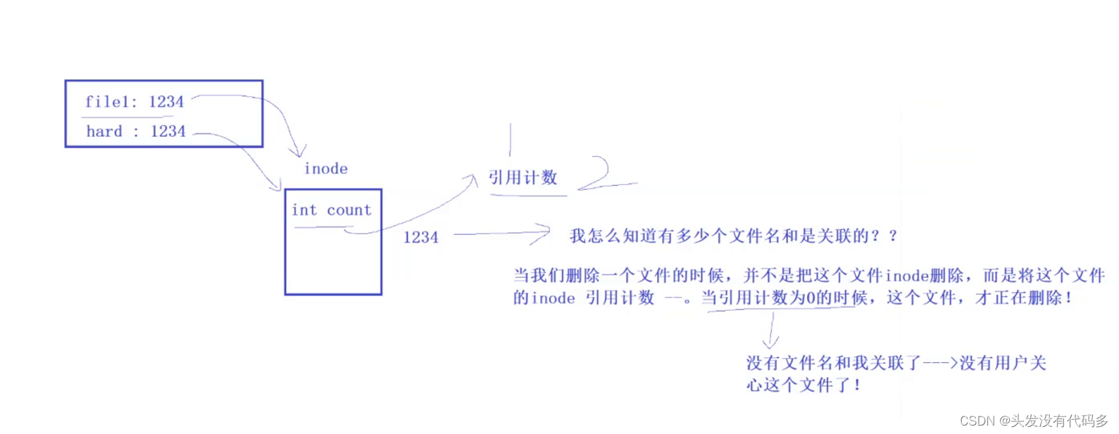 硬链接:创建硬链接,就是在指定的目录下建立了文件名和指定Inode的映射关系。就是起别名。