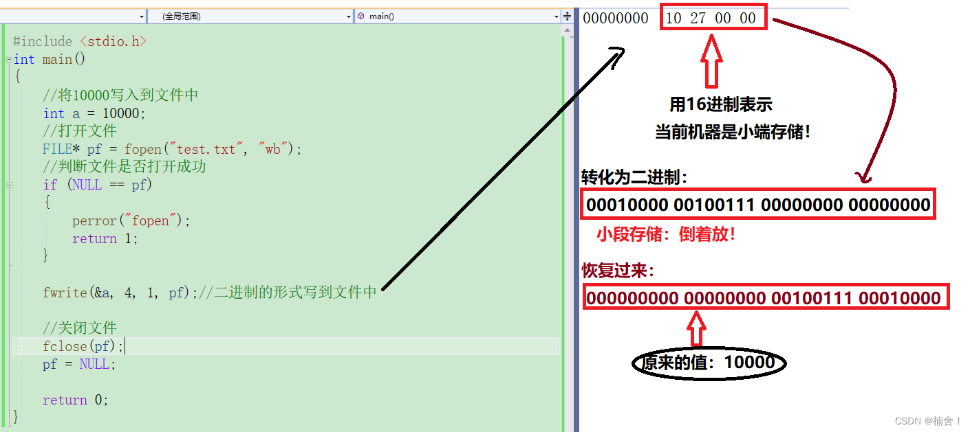 #includeint main() {//将10000写入到文件中int a = 10000;//打开文件FILE* pf = fopen("test.txt", "wb");//判断文件是否打开成功if (NULL == pf){perror("fopen");return 1;}fwrite(&a, 4, 1, pf);//二进制的形式写到文件中//关闭文件fclose(pf);pf = NULL;return 0; } 画图解析:
