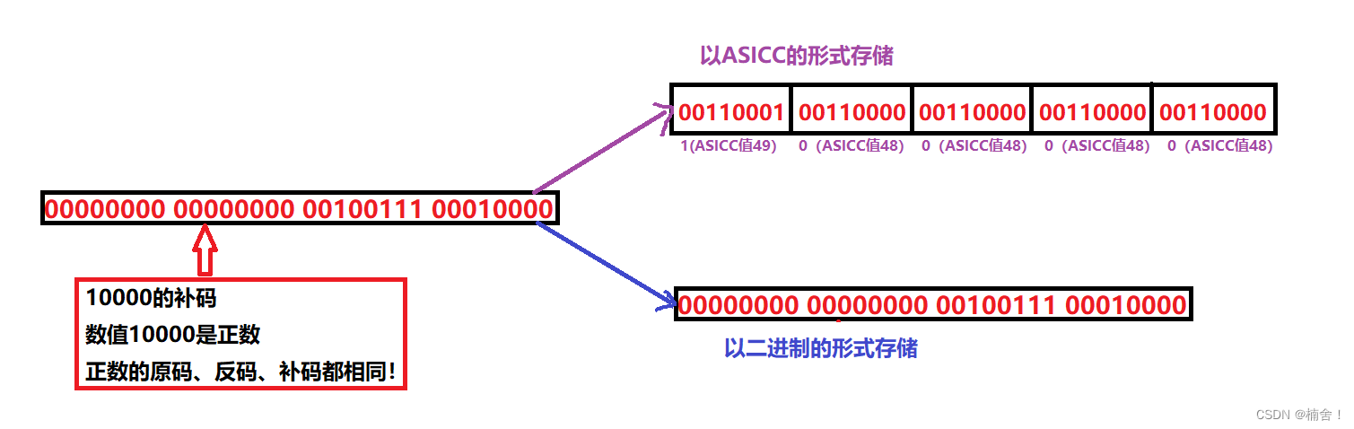 字符一律以ASCII码形式存储,数值型数据既可以用ASICC形式存储,也可以使用二进制存储,假设由数值 10000,若以ASICC码形式存储总共占4个字节,若用二进制存储总共占4个字节!
