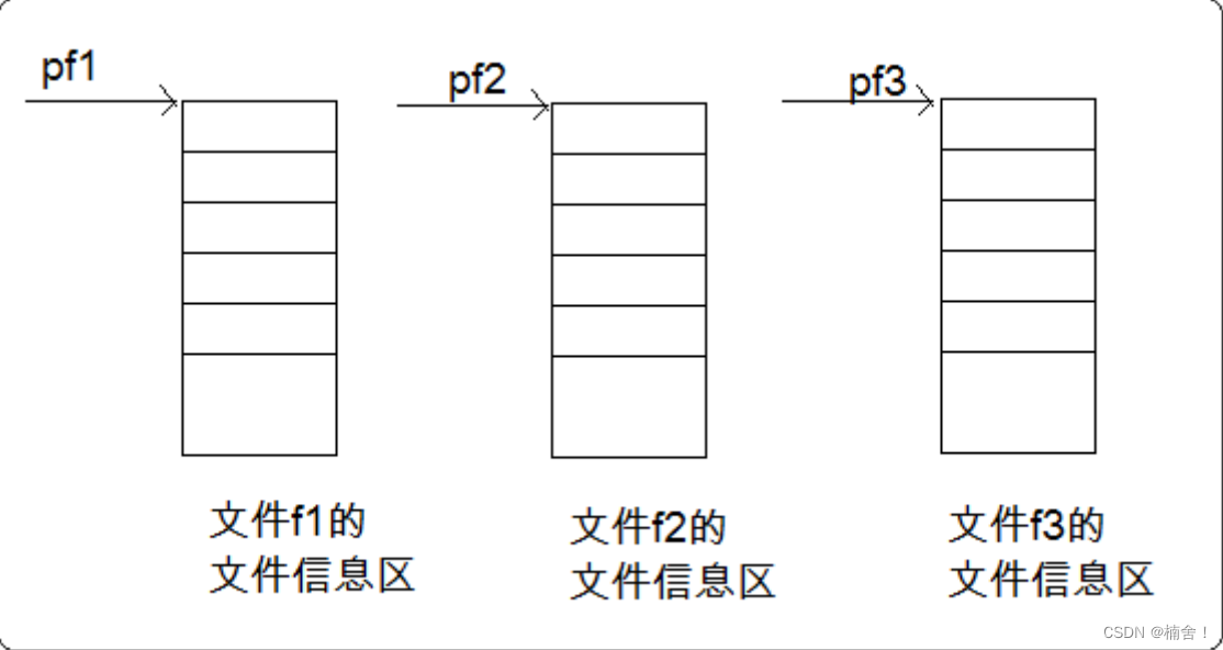 其中pf1、pf2、pf3 都是FILE类型的指针变量也就是文件指针,分别指向 f1、f2、f3 三个文件的文件信息区,通过文件信息区可以访问该文件!