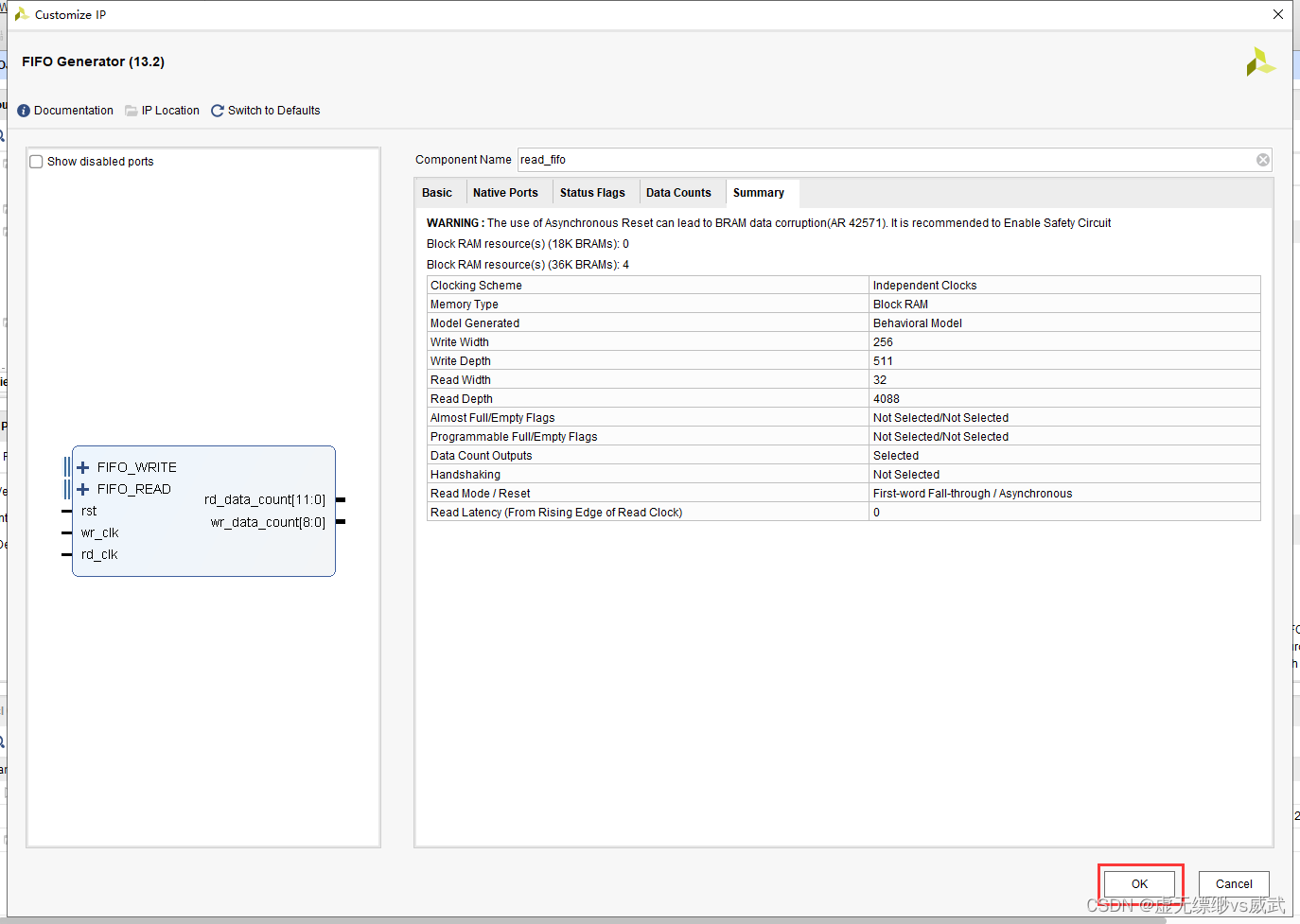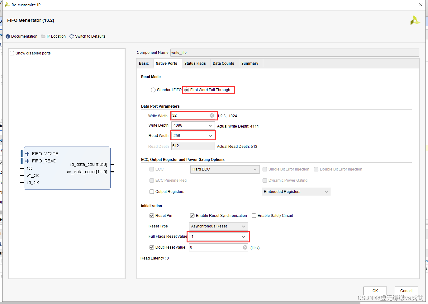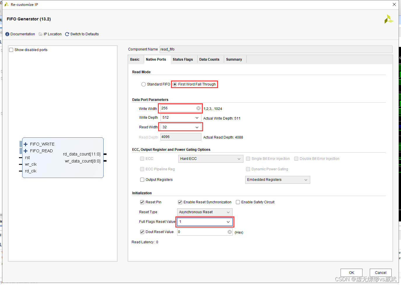 设置写位宽为256,设置读位宽为32位,并且设置高电平复位