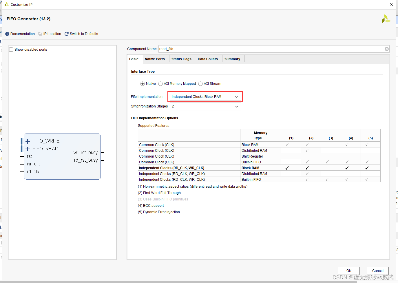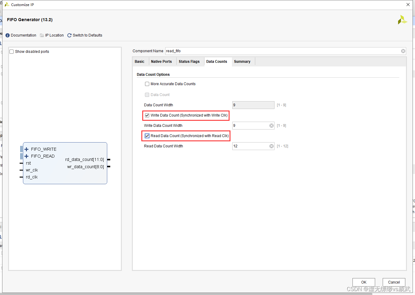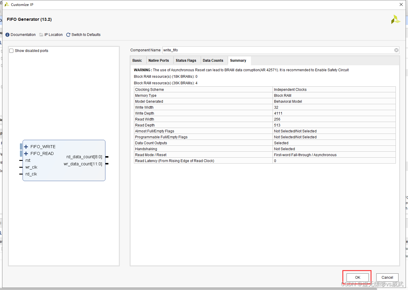 设置写位宽为256,设置读位宽为32位,并且设置高电平复位