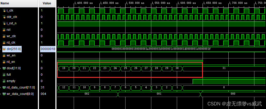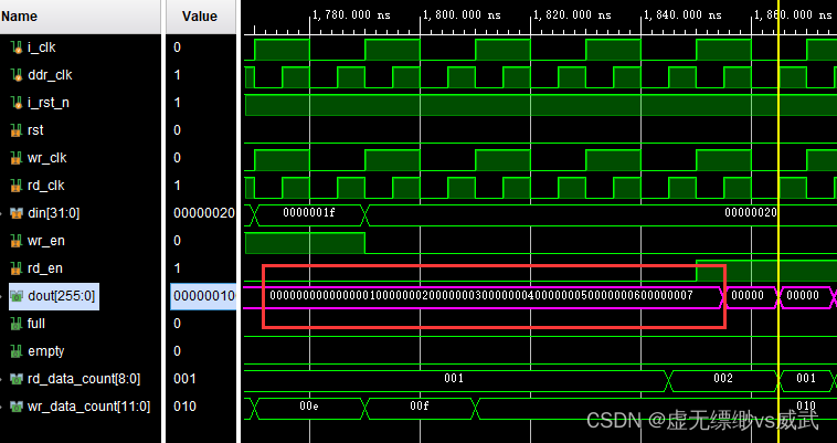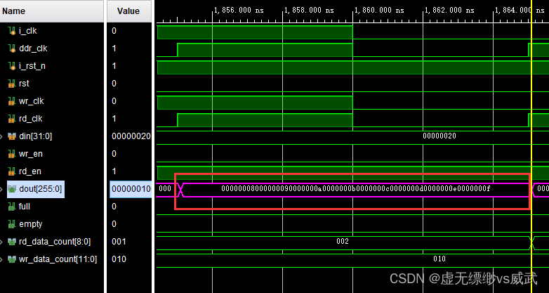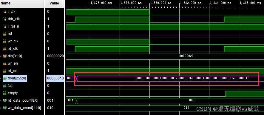 验证fifo写入数据和读出数据是否一样,从图中可以看到fifo写入的最后一个数据是1f,rd_data_count为2时产生一个读使能,读出来了四个256位宽的数据,读完成后fifo的empty信号拉高,代表数据都读出为空了。