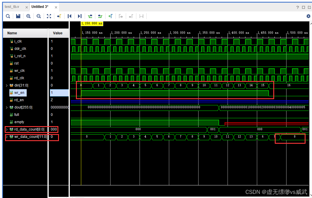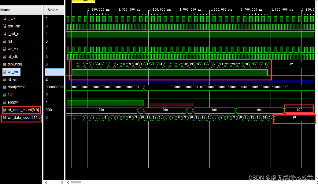 可以看到wr_en为1写入了0~15一共16个数据,但fifo的写计数wr_data_count输出为8也就是总数据的一半,而fifo读计数rd_data_count输出为1也就是fifo写计数wr_data_count的8分之一。