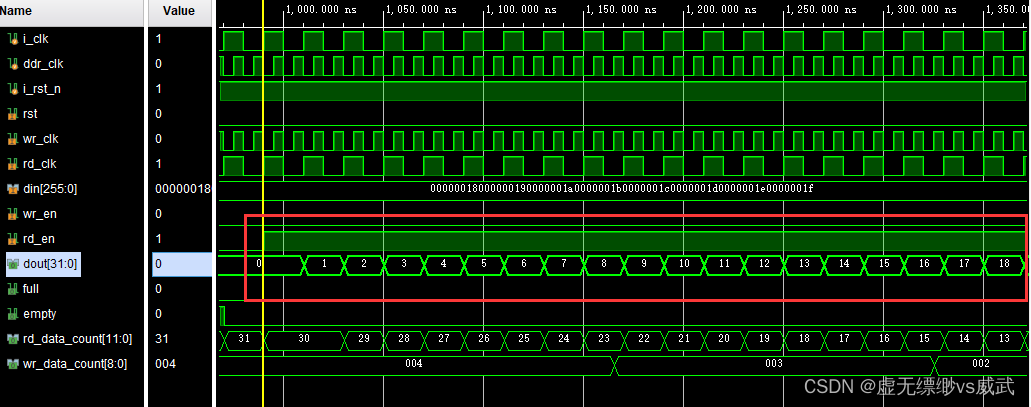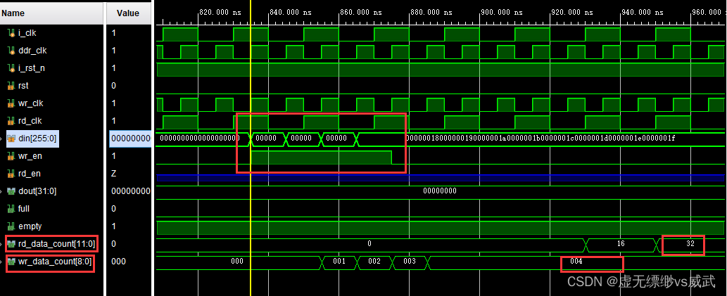 从下面的截图我们可以看出,一共写入四个256位宽的数据,fifo的写数据计数wr_data_count为4,fifo的读数据计数rd_data_count为32,我们刚好写入的是32个32位也就是4个256位,所以fifo写计数wr_data_count为实际写入的256位数据的个数,也就是ddr输入接口位宽的数据个数为4,而读计数的rd_data_count为输出接口32位宽的数据的个数为32