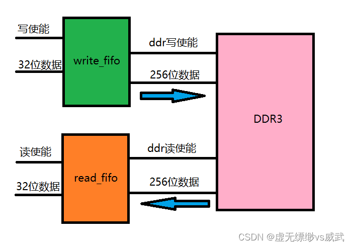 在上篇博客中,我们只是进行突发读写,没有使用读写fifo对ddr3进行读写,因ddr3读写接口都是256位宽,所以ddr3的读写fifo输入和输出都是32位,和ddr3对接的接口都是256位,如下面示意图所示。下面的截图为ddr3的fifo读写功能示意图,本章节侧重于对write_fifo和read_fifo的仿真
