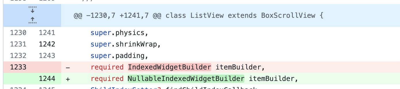 这意味着 itemBuilder 不能再返回 null,而本次跟新该设定已经通过 NullableIndexedWidgetBuilder 修复。
