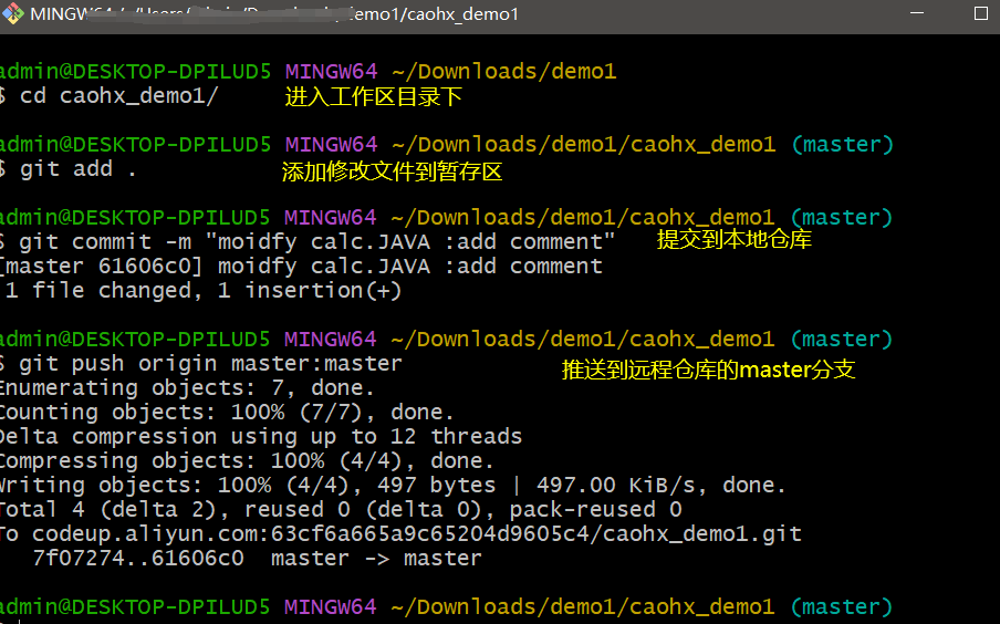 表示把本地的master分支推送到 codeup_demo1远程仓库的master分支上