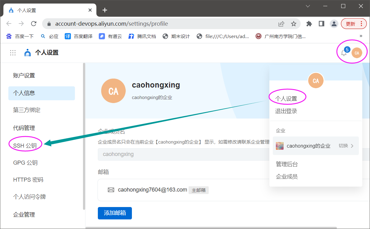 在云效 中点击 右上角头像 -> 个人设置 ->SSH公钥 ,