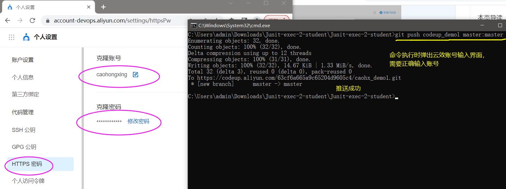 命令行中输入在云效仓库中的两条命令,将用户名和密码改为自己的用户名、密码
