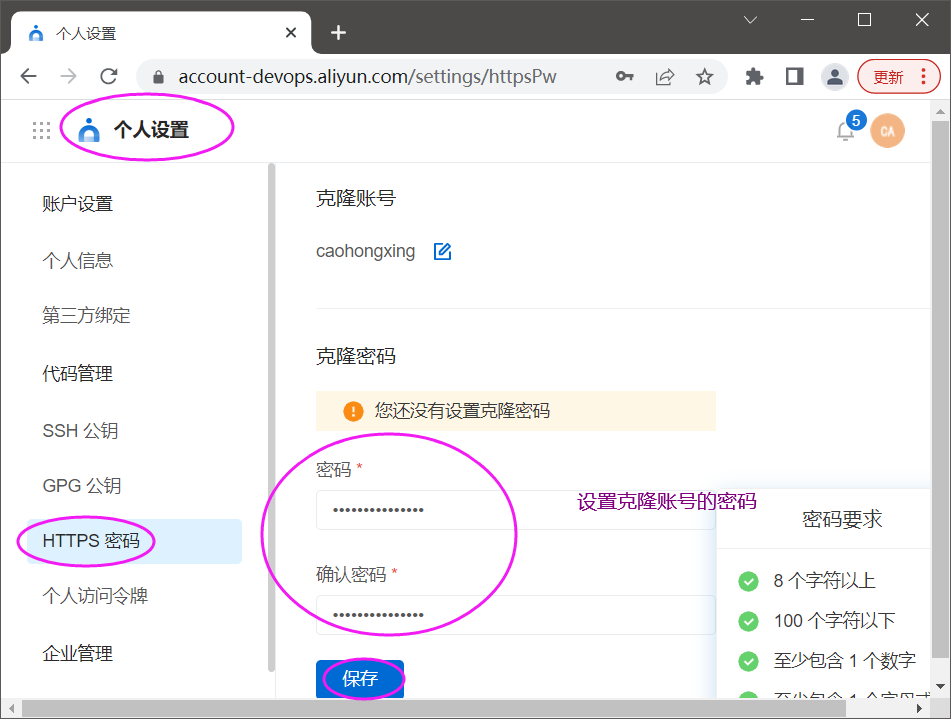 在云效上设置克隆账号的密码