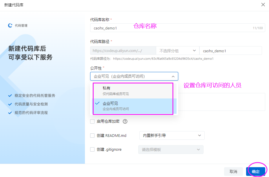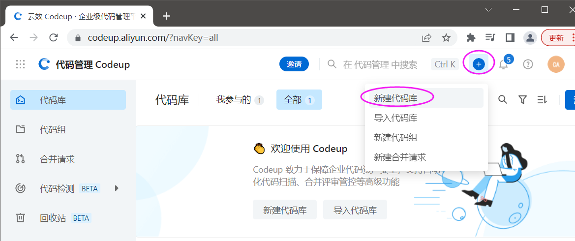 1 进入云效后,点击右上角的“+”,在弹出菜单上点击【新建代码库】