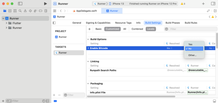你可以通过打开 ios/Runner.xcworkspace 并将 Enable Bitcode 设置为 No 来实现,Add-to-app 的开发人员可以在宿主 Xcode 项目中禁用它。