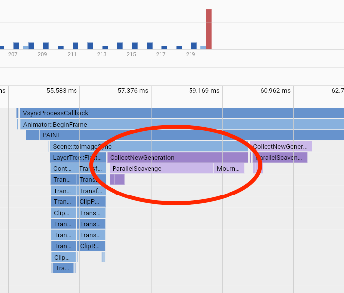 在低延迟模式下,Dart VM 的内存分配器会倾向堆增长而不是垃圾收集,以避免因 GC 暂停而中断过渡动画。