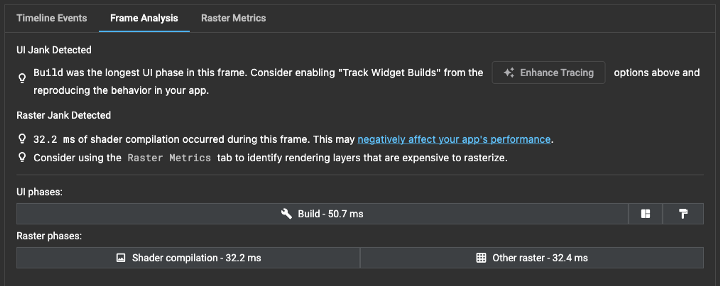 可能包括有关跟踪到的 frame 的 expensive 操作的建议,或有关在 Flutter 框架中检测到的 expensive 操作的警告。