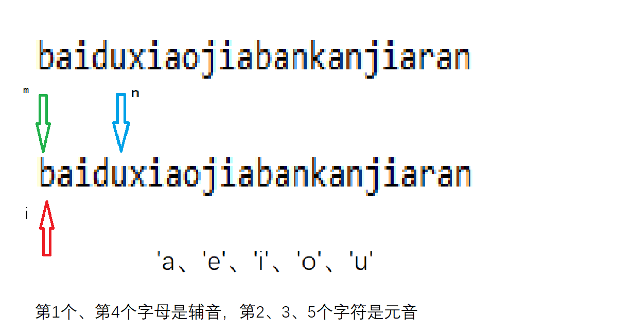 3 (2022百度)小红拿到了一个字符串,她想知道有多少个"baidu"型子串?所谓"baidu“型字符串,指第1个、第4个字母是辅音,第2、3、5个字符是元音,且每个字母都不相同的字符串。例如,"taigu"、"huida"、"paobu"、"baoli"等都是"baidu"型字符串。我们定义元音字母仅有'a、'e'、'i'、'o'、'u'这五种,其余字母均为辅音字母。