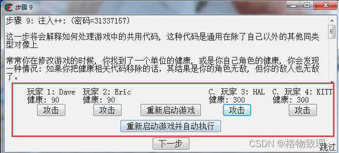 然后点击Tutorial-x86_64.exe的步骤9界面,点击“重新启动游戏并自动执行”,然后随便“攻击”一个玩家,就可以激活“下一步”按钮了。