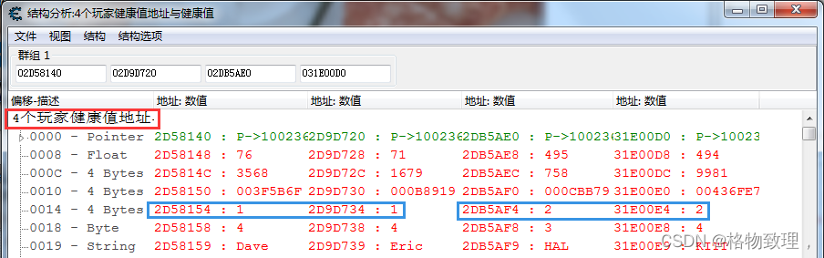 当然,如果我们只是找这个四个玩家健康值的地址,前面早就找出来了,根本不用这么麻烦。下面的步骤才是关键,那就是分析数据。
