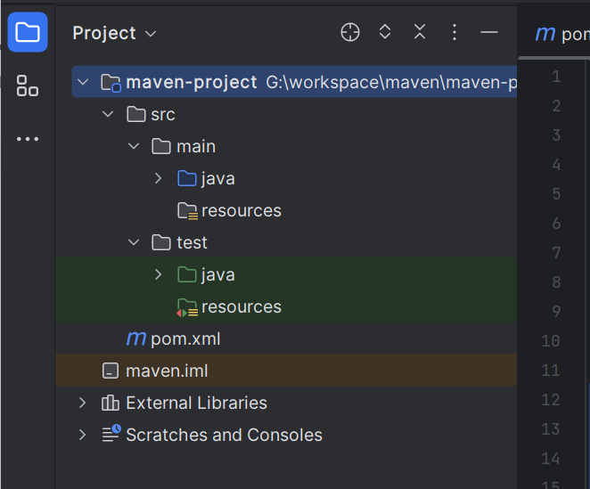 点击 create 开始创建,这里的过程可能比较慢,甚至比你想象的更慢,安心等待,创建成功以后,会自动生成一个 Maven 项目的模板,此时可能缺少某些文件目录,按照需求补齐。例如在源代码文件目录和测试代码文件目录都没有resources 配置文件目录,可手动添加,如图: