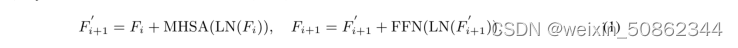作为输入,ViTPose首先通过 patch embedding 层将图像嵌入到tokens中,即F∈,其中d(默认为16)为 patch embedding 的下采样比,C为通道维数。在此之后,嵌入的tokens被多个vision transformers处理,每个变压器层由一个多头自注意(MHSA)层和一个前馈网络(FFN)组成,即: