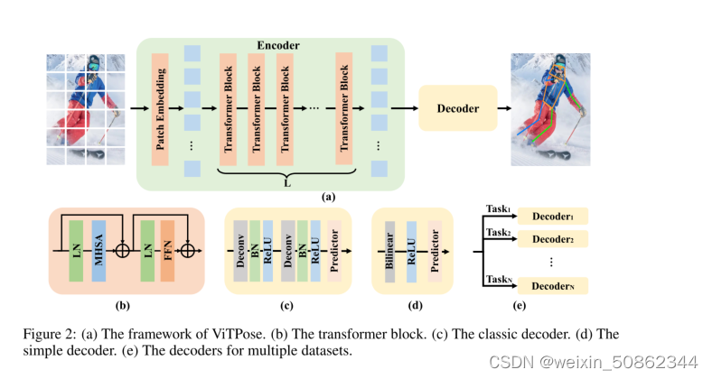 图2:(a) ViTPose的框架。(b)transformer块。(c)经典解码器。(d)简单解码器。(e)用于多个数据集的解码器