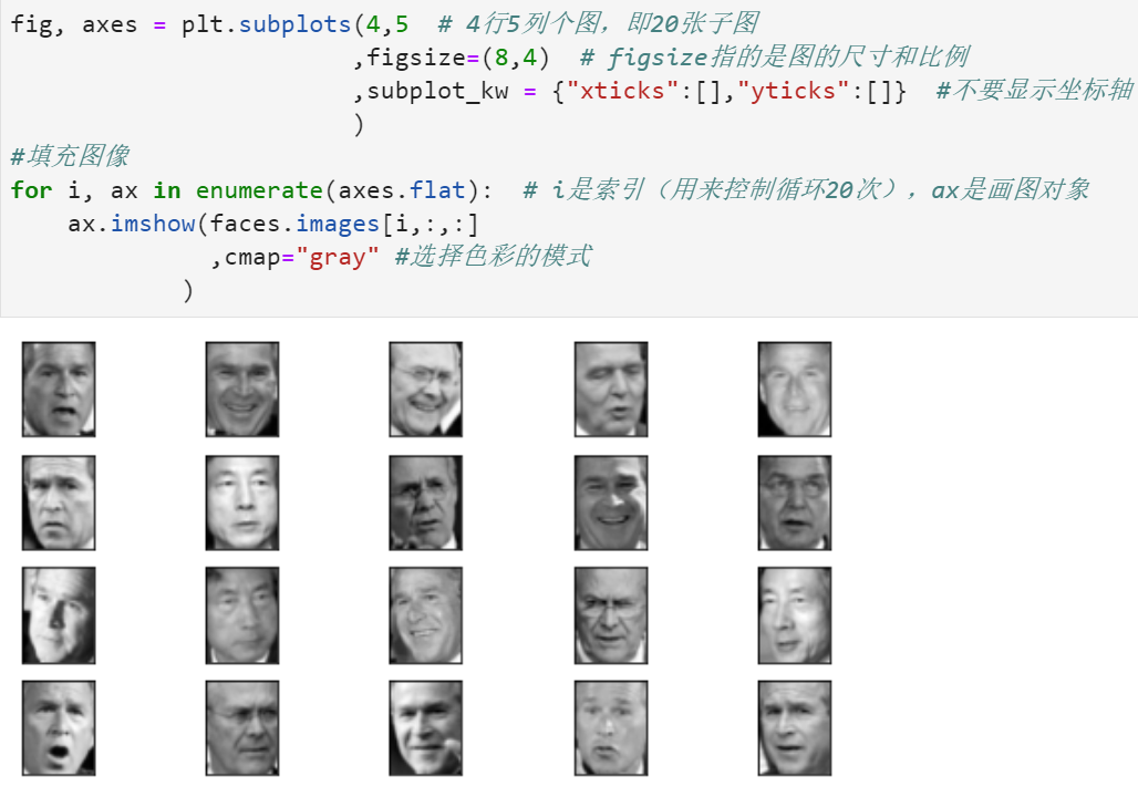 for i, ax in enumerate(axes.flat): # i是索引(用来控制循环20次),ax是画图对象ax.imshow(faces.images[i,:,:] ,cmap="gray" #选择色彩的模式)# cmap参数取值选择各种颜色:https://matplotlib.org/tutorials/colors/colormaps.html