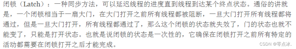 CountDownLatch是闭锁的一个实现,允许一个或多个线程等待某个事件的发生。其内部是一个正数计数器,初始化时指定一个正数,countDown()方法对计数器进行减操作,await()方法就是这个闭锁的大门,计数器不为0时,await()方法的线程会被阻塞,当计数器为0时,await()方法的线程才会继续执行。