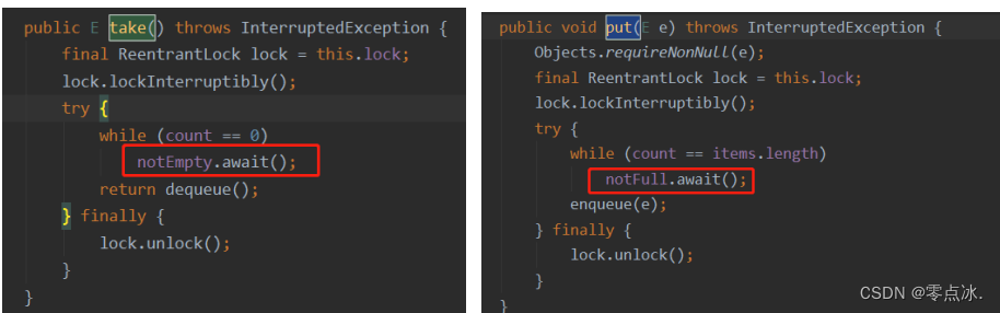 非满时,put会通知其他put;非空时,take会通知其他take。