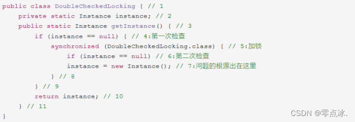 在2、3步可能发生指令的重排序,可能出现,instance已经指向了一个地址,但是对象还没有初始化,此时另一个线程就可能获取到一个没有初始化的对象。而volatile修饰的变量,禁止重排序,以此来解决这个问题。