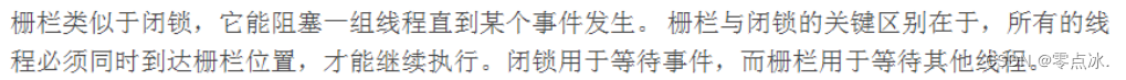 栅栏类似于闭锁,内部也有一个正数计数器,初始化时指定一个正数,每当有一个线程使用await()方法时,计数器加1,当前线程阻塞,直到计数器的值为初始化的正数时,打开栅栏。